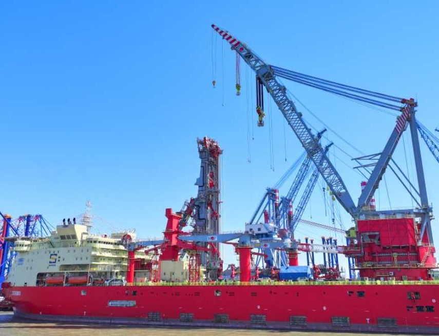 据了解,JSD6000深水起重铺管船是全球最先进的海工船之一,集成了世界先进的船舶技术、智能控制系统以及高强度材料。该船舶总长215.88米、型宽49.00米、型深14.70米、最大吃水10.834米,可容纳399人,配备5000吨全回转起重机、J-Lay、S-Lay两型铺管系统、8点定位锚泊系统和DP3动力定位系统;功能强大,作业能力范围广,可铺设管径覆盖6至60英寸,具备单船浅水、深水、超深水铺管作业能力,可在3000米超深水海域的海洋环境中进行高效、安全的海上油气铺管作业。