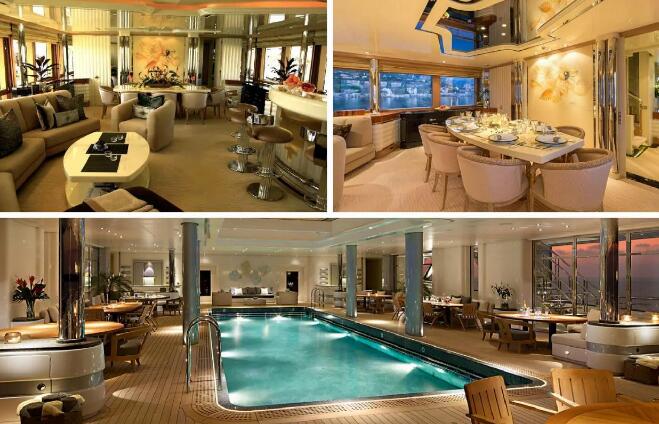 Eclipse的巨大尺寸为船上的许多奢华设施提供了空间,包括24间客舱、两个游泳池、几个热水浴池和一个迪斯科舞厅,更不用说两个直升机停机坪、三艘发射船和能够装载50人的迷你潜艇。