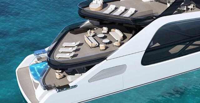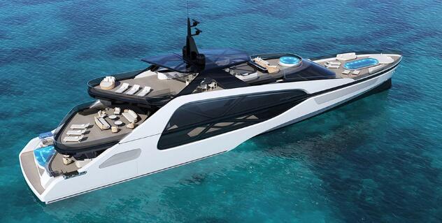 这位意大利设计师以为阿兹慕·贝尼蒂等公司设计未来主义风格的游艇而闻名,他刚刚推出了一款具有非常规外形的新游艇。“Onda”得名于意大利语中“海浪”的意思,其特点是锋利的船首和超光滑的船体,可帮助其穿越海浪,而船中部的大型玻璃面板将客人与周围环境联系起来。 不过,变得有趣的地方是在船尾。据国际游艇组织报道,这艘164英尺长的游艇展示了一系列不对称的船尾甲板,这些甲板层叠而下,一直延伸到水面。Struglia的同名工作室表示,这创造了“全新节奏的阴影区和阳光区”。上层甲板设有酒吧和露天用餐区,而主甲板是一个大型的、诱人的休息室。下层是一个645平方英尺的大型海滩俱乐部,中心是一个三角形的游泳池。