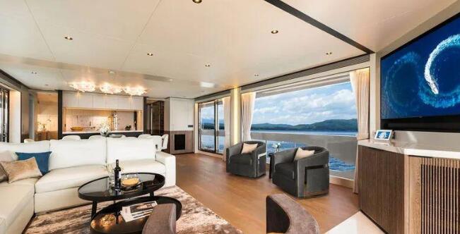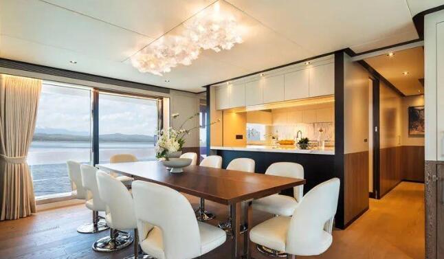 ![]() 主沙龙提供了一个宽敞的绿洲,一个大型L形座位区通过大窗户邀请人们交谈和欣赏美景。滑动门为用餐区提供了一种户外的感觉,它既是一个早餐酒吧,也是一个正式的室内餐桌,配有一个可转换的餐桌。