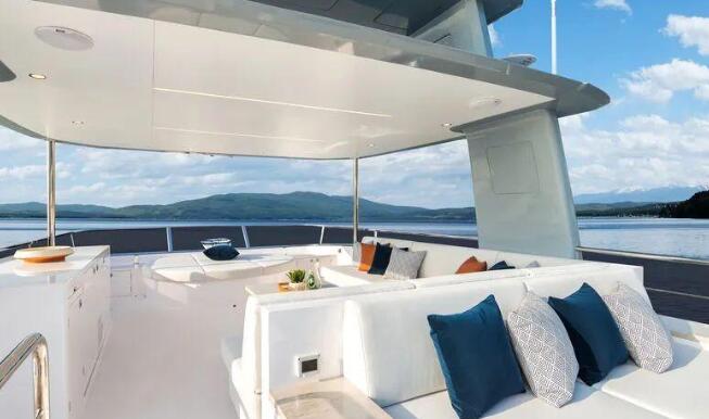 ![]() 这艘旗舰游艇为休闲和娱乐提供了充足的户外空间。封闭的空桥休息室有一个湿酒吧,葡萄酒冷却器和许多座位供客人享受。桥甲板尾部配备了一个烧烤架和一个L型躺椅,它可以转换成一个完整的太阳浴垫,由遮阳篷保护。