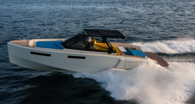 新来者建立在成功的Evo R4的基础上,并与其前身分享同样的时尚、活泼线条。与整个Evo系列一样,43英尺长的Evo在布局和装饰方面都高度可定制。它还拥有与埃沃之前的一些车型相同的Transformer风格的船尾,这些车型在两侧都有开口。然而,使这艘船与众不同的是创新的船尾平台。 该平台由设计师瓦莱里奥·里维里尼设计,由贝森佐尼开发,当你想玩水上玩具或潜水时,它可以下降到吃水线以下约30英寸。它还可以向相反的方向抬起,充当梯子,把你连接到高墩上。同时,当平台与吃水线平齐时,海滩俱乐部的长度增加了大约三英尺。