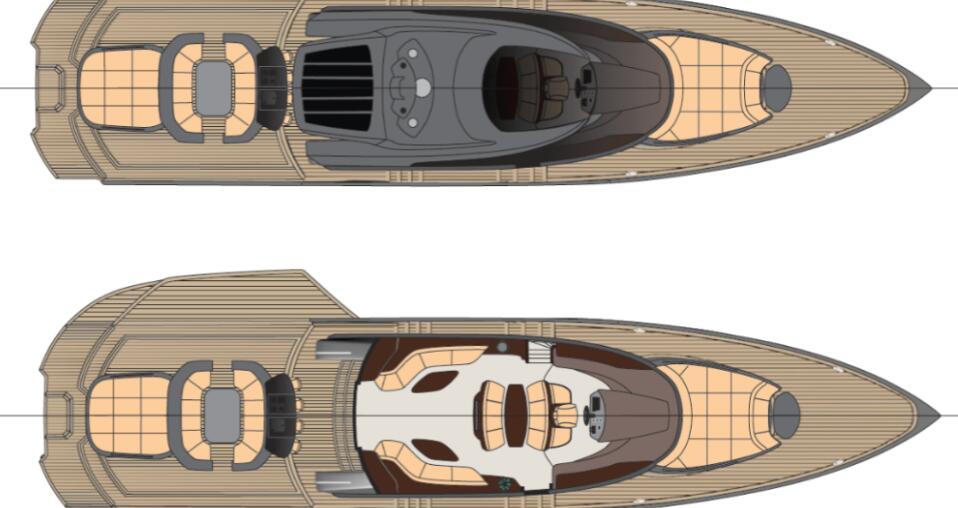 这艘游艇的另一个功能是巧妙的艇库设计,由于尺寸问题,因此船尾休息区和泳池配有一组液压升降支腿,升高后即可部署水上玩具,到目前为止,这种设计还是首次出现。 |