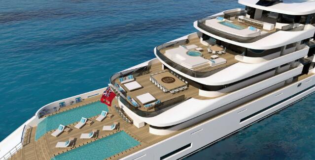 如今,超级游艇上的无边泳池是相当标准的——一般会在某一层甲板船尾设计一个泳池,但在同一甲板一个位置同时设置两个泳池则是相当新颖的设计。而这一新颖的特征就是这艘巨型游艇概念设计的亮点之一。