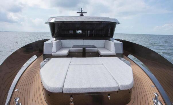 开放式布局以主甲板为中心,这里有一间巨大的沙龙、一间餐厅和一间厨房。一段楼梯直通主人套房、三间客用双人间和一间独立的日间套房,而滑动门通往船尾甲板的座位区。在户外的其他地方,前甲板配备了一个舒适的U型沙发和一个大型日光浴床,船头设有另一个户外休闲场所,液压游泳平台可以存放一艘附属艇。